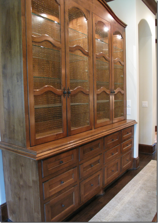 The French styled cabinetry has doors finished with wire, just as in the study and master bathroom. Touches like this repeated throughout a house provide design cohesiveness. Notice too that many of the built-in cabinets have arched tops – just as doorways in the house are arched. Again – repetition of a design element makes it that much more powerful.