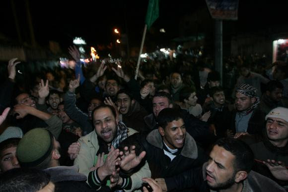 Palestinians celebrate in Rafah, Gaza, near the border with Egypt on February 11, 2011 following news that embattled President Hosni Mubarak stepped down after three-decades of autocratic rule and handed power to a junta of senior military commander. UPI/Ismael Mohamad